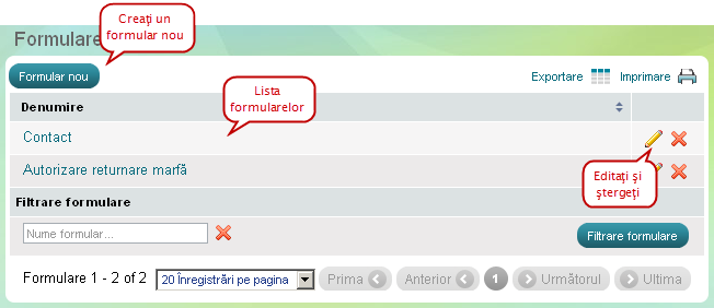 Pagina 'Formulare' vă permite să personalizaţi formularul Contact şi să creaţi oricât de multe formulare personalizate doriţi. În pagina Formulare puteţi vedea, edita, şterge şi filtra toate formularele disponibile.