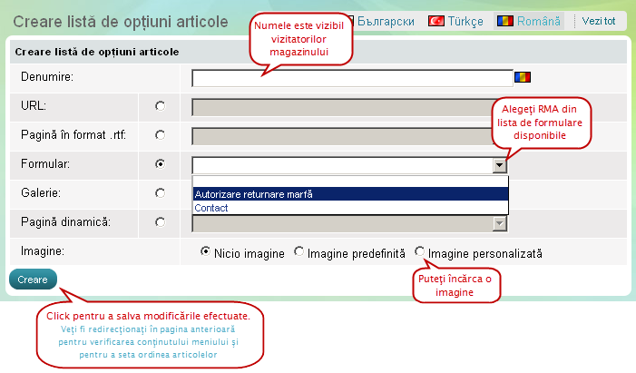 Dacă nu sunteţi mulţumiţi de lista de formulare existente, trebuie să creaţi o nouă pagină şi apoi să reveniţi la 'Articole meniu' pentru a adăuga noua pagină.
