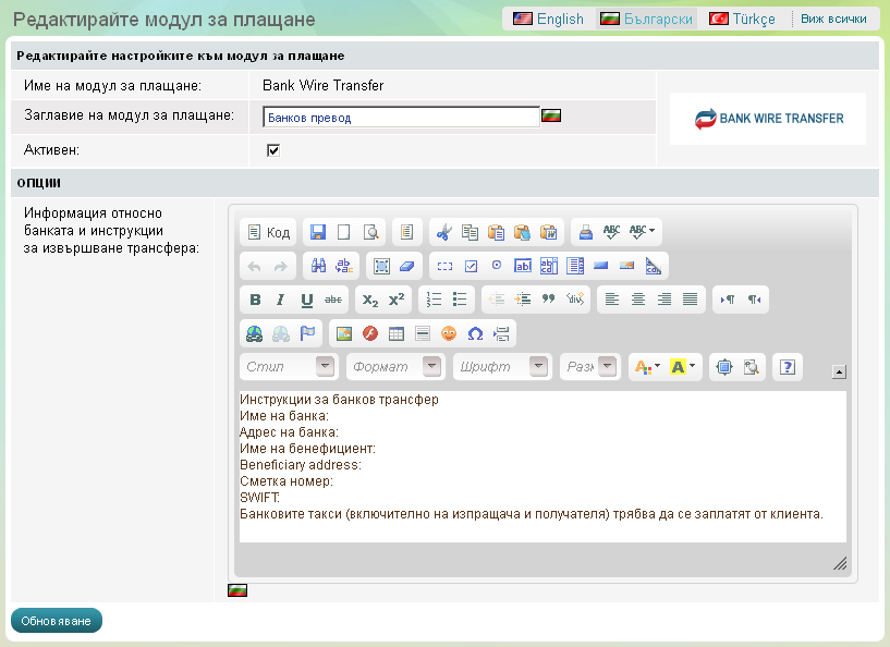 Можете лесно да създадете, обновите и форматирате информацията за банковия трансфер с помощта на вградения WYSIWYG(What You See Is What You Get) редактор.