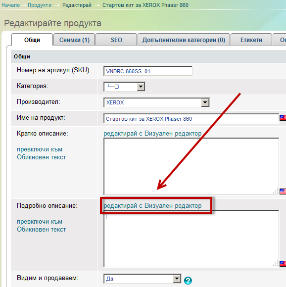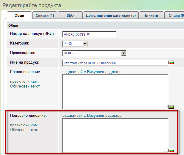 Не забравяйте да въведете продуктовото описание на всички активни за вас езици. Натискането на този бутон ще покаже допълнителни полета за въвеждане.
