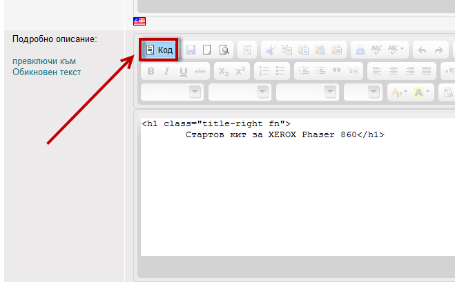- Преди да поставите кода в описанието, трябва да превключите Визуалния редактор в режим Код като натиснете върху бутона Код.