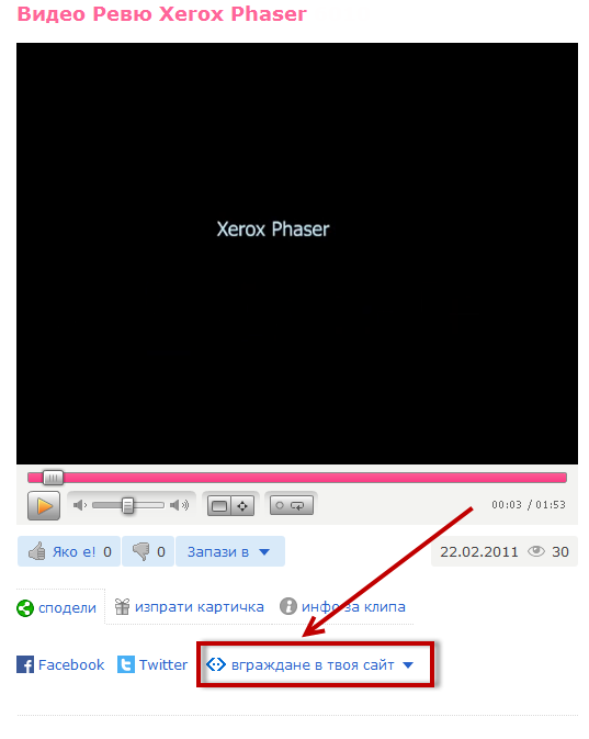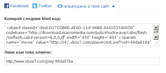 За вграждане на видеоклип от vbox7, ето как изглеждат нещата при тях: