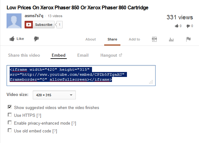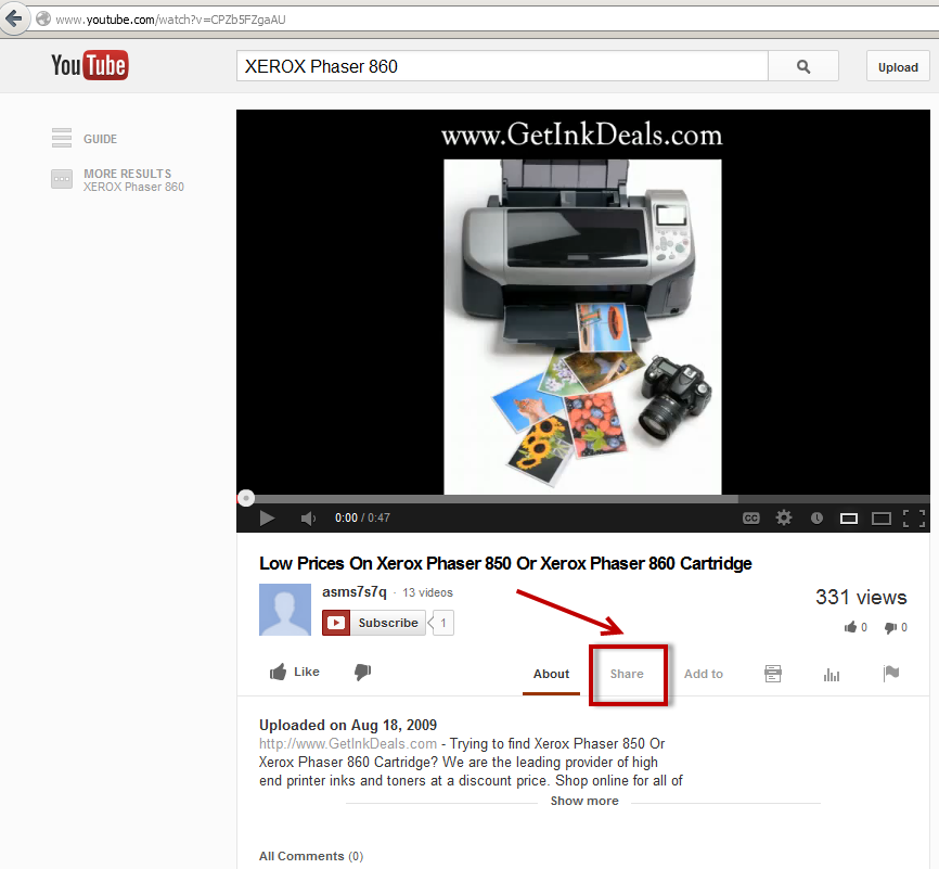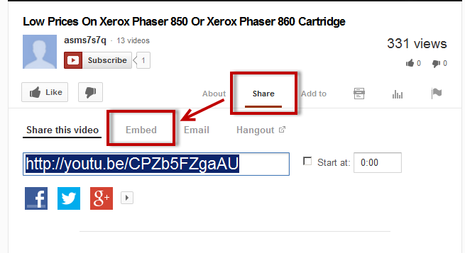 - Отворете клипа, който искате да качите в описанието на продукта Ви. Под всеки клип в youtube има бутон - Share. Youtube непрекъснато правят леки промени по дизайна и подредбата на сайта си, но неизменно винаги ще намерите такъв бутон под всяко клипче. Натиснете върху него и ще се покаже ново съдържание. Този бутон ще Ви предостави различни начини за споделяне на клипчето. Вас Ви интересува поставянето на клипчето на друг уебсайт.