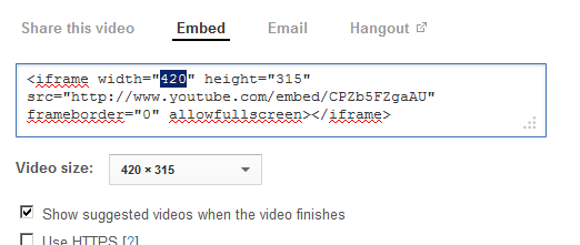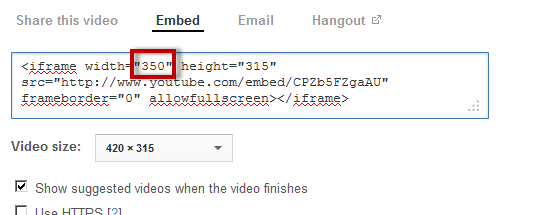 Share - Embed - Video Size: От това падащо меню можете да изберете какъв да бъде размерът на клипчето при визуализиране пред потребител на вашия сайт. Ако пък желаете да изберете размер, който го няма в падащото меню, можете да промените два параметъра в самия код по следния начин:
