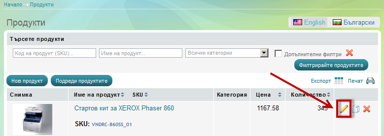 Изберете продукта, в чието описание желаете да поставите клипче и натиснете моливчето, за да отворите страницата за редакция.