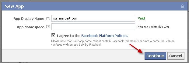 - В появилият се прозорец въведете App Display Name. Най-добре е това да бъде домейна на магазина. Сложете отметка на I agree to the Facebook Platform Policies. и натиснете върху Continue.