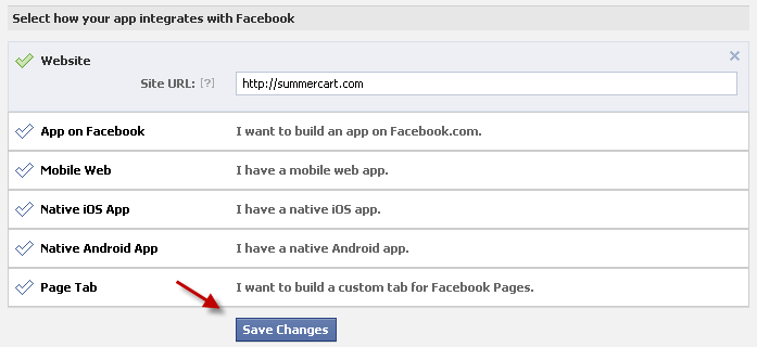 - В раздел - Select how your app integrates with Facebook, натиснете върху - Website и въведете адреса на магазина заедно с http:// и натиснете върху бутона - Save Changes.