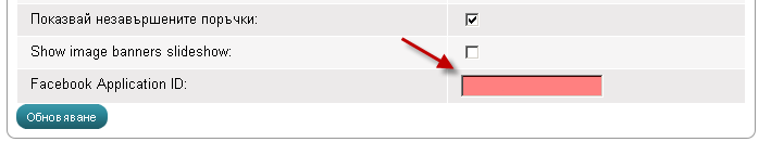 - Отворете административната област на магазин Ви -> Настройки -> Общи -> Други. Намерете и въведете App ID в полето - Facebook Application ID.