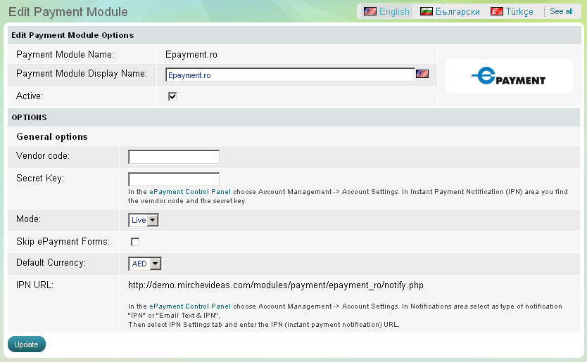 Vendor code, Secret Key Summer Cart store owner is required to enter his or her Vendor Code and Secret Key. In the ePayment Control Panel choose Account Management -> Account Settings. In Instant Payment Notification (IPN) area you will find the verndor code and the secret key. Mode Test mode is only used in the initial setup phase to make online purchases without processing real card data. Remember that for secure real-time transactions your store must be switched to "Live" mode. Skip ePayment Forms