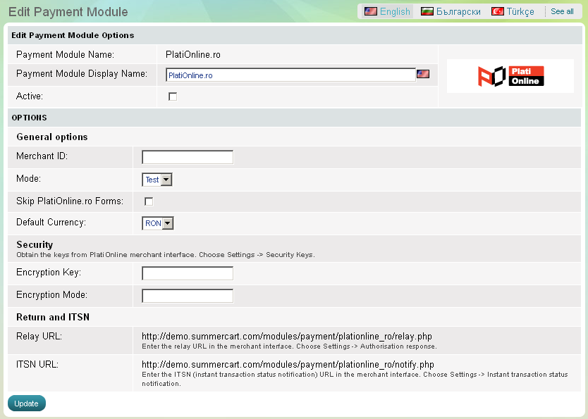 Merchant ID Summer Cart store owner is required to enter his or her Merchant ID provided by PlatiOnline.ro Mode Test mode is only used in the initial setup phase to make online purchases without processing real card data. Remember that for secure real-time transactions your store must be switched to "Live" mode. Skip PlatiOnline.ro Forms Default Currency