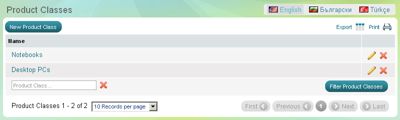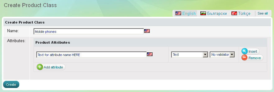 Use 'Product classes' page to create a new product class (e.g. Notebooks) and define the belonging attributes (e.g. operating system, weight, CPU speed, display size, etc). You can also edit or delete a product class, as well as add, edit and delete specific product attributes. You can use 5 types of attributes