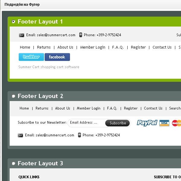 В Summer Cart има мощен, но прост редактор на дизайна, който е вграден директно в административната област на онлайн магазина. С негова помощ имате пълна свобода да променяте визията на магазина и да го нагласяте спрямо вашите нужди.