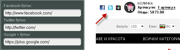 Facebook, Twitter и Google+ бутон - В началната част на магазина Ви ще се покажат малки иконки на съответните социални мрежи. Въведете къде да бъде отвеждан потребителя при кликване върху иконките.