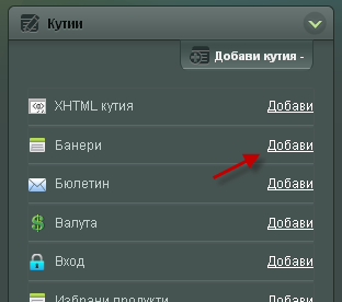 В Summer Cart има 19 вида кутии. Всяка от тях има различни настройки, други нямат никакви настройки. С натискане на връзката Добави Вие ще добавите конкретната кутия в подредбата която редактирате.