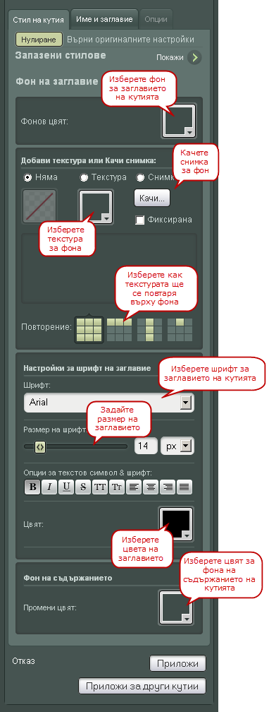 От тук можете да изберете това какъв да бъде фона на кутията, както и цвета и вида на шрифта на заглавието.