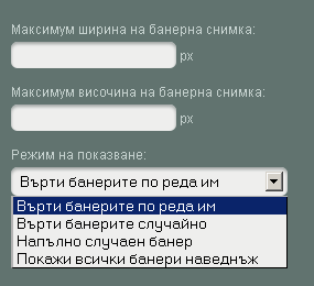 Режим на показване - изберете начина по който ще се показват банерите в конкретната кутия. Възможните избори са - Върти банерите по реда им, Върти банерите случайно, Напълно случаен банер и Покажи всички банери наведнъж.