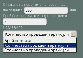 Отчитане на поръчките направени за последните - задайте за какъв период да се отчитат направените поръчки..Брой поръчки, Количество продадени артикули или Стойност на продадени артикули.