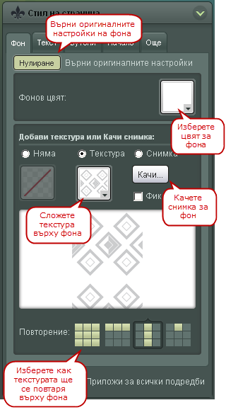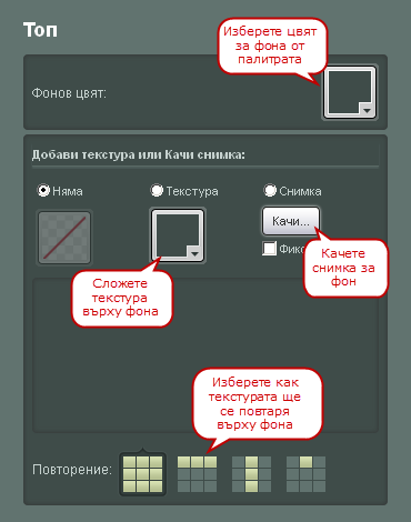 - Добави текстура или Качи снимка - добавете текстура към фона като я изберете от предварително зададените или качите снимка за фон през бутона "Качи...". Ако решите да качите снимка за фон можете да фиксирате фона така, че при скролиране с мишката той да не се мести. Можете да го направите като сложите отметка на "Фиксирана"