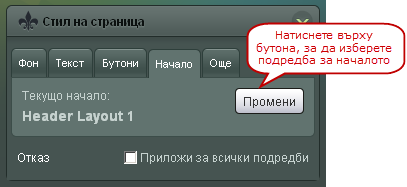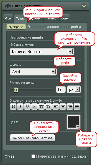 Раздела "Стил на страница" отговаря за цялостния изглед на страницата. Тази част от дизайн редактора е разделена на няколко части, ще Ви обясним как работи всяка една от тях: