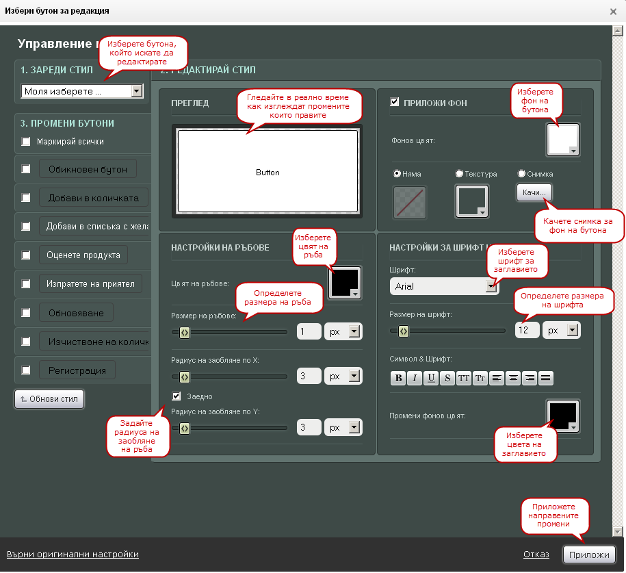 След като направите желаните от Вас промени натиснете бутона "Обнови стил", за да ги запаметите. Сега можете да преминете към промяната на друг бутон/бутони. Ако няма да редактирате повече бутони, натиснете върху бутона "Приложи" в долния десен ъгъл.