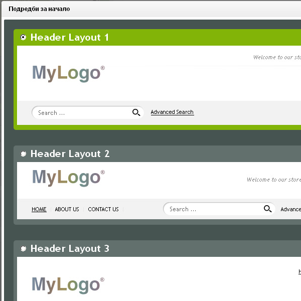 И тук както и в предишния раздел има само един бутон - "Промени". От него можете да изберете подредбата за началото на магазина Ви. Подредбите са предварително зададени и са 5.