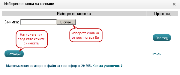 Качи - след натискане на бутона ще излезе познатия Ви вече прозорец за качване на изображение. Изберете картинка от компютъра Ви, след което натиснете бутона Затвори. Картинката е качена.
