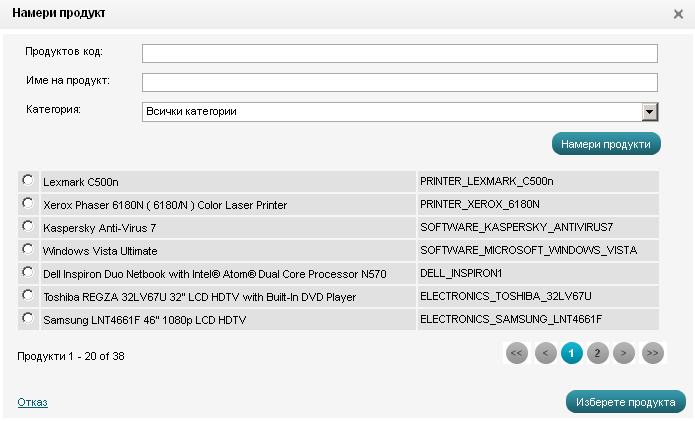 - Продукт - Натиснете върху бутона "избери продукт" и ще се покаже нов прозорец. Изберете от него продукт до който да води банера