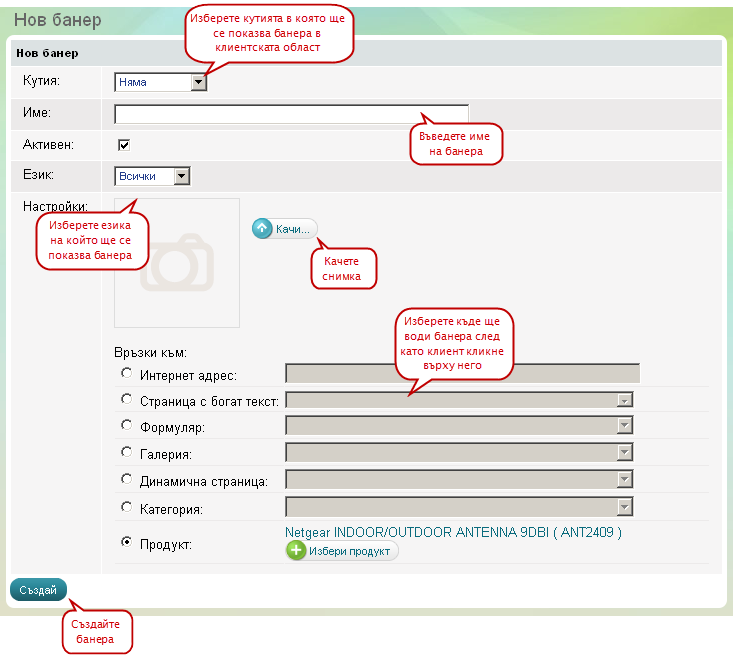 След като направите необходимите настройки по банера натиснете върху бутона - "Създай", за да създадете банера.