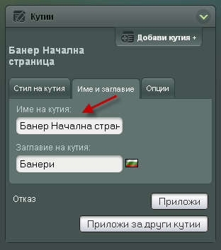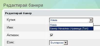 Кутия - Изберете кутията в която ще се показва банера. Ако нямате вече създадена банер кутия е необходимо да създадете такава през Дизайн редактора