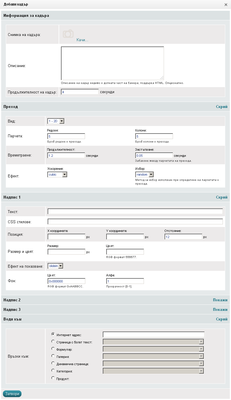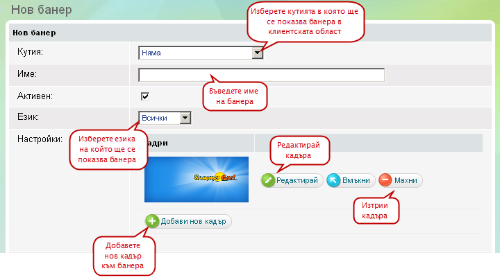 - Описание - въведете описание на кадъра което се показва в долната част на банера. В описанието можете да въведете и HTML код