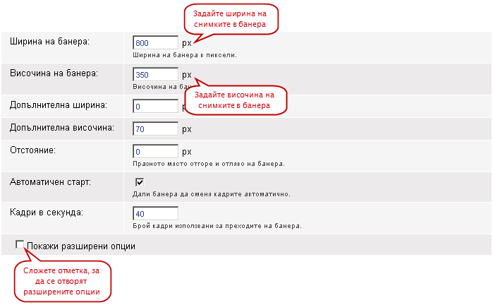 До тук бяха опциите които са необходими, за да създадете банер от този тип. Ако сложите отметка на "Покажи разширени опции" ще се покажат допълнителните настройки които не са задължителни.