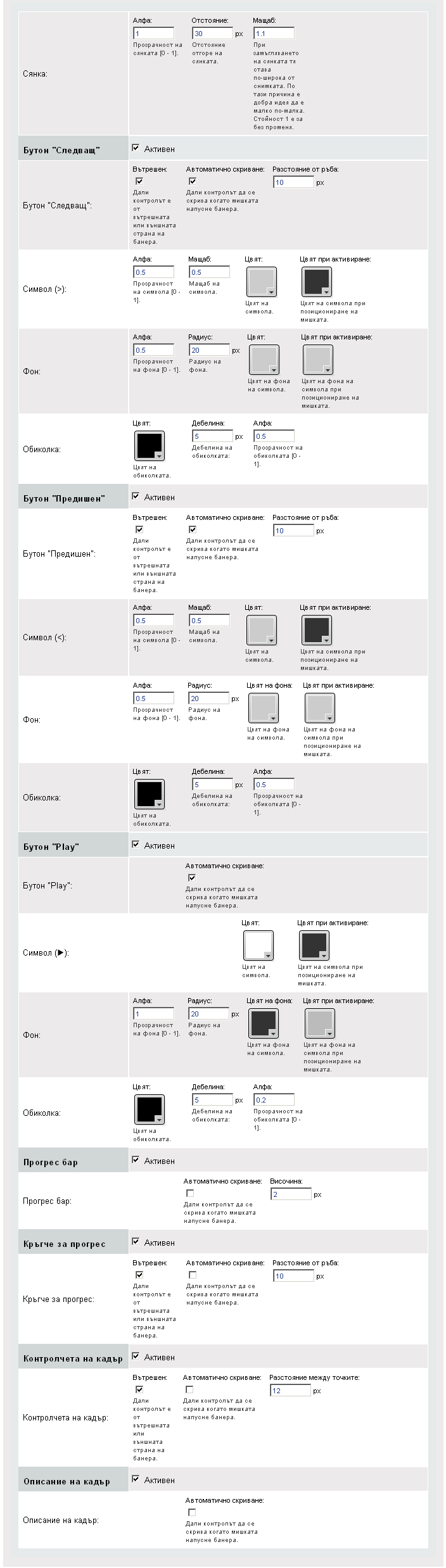 - изберете дали контролчетата на кадъра да се скрива когато мишката напусне банера