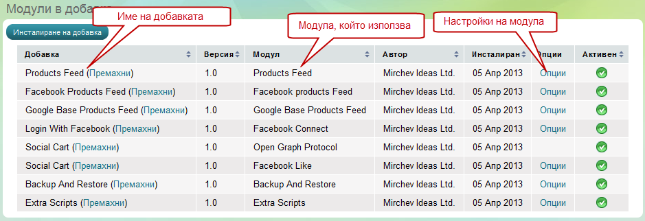 След като системата зареди, ще видите списък на всички инсталирани добавки, а също така и известно количество информация относно тях като - версия, модул, автор, дата на инсталиране, опции (ако има такива) и статус. След това изберете "опции" срещу "Product feed".